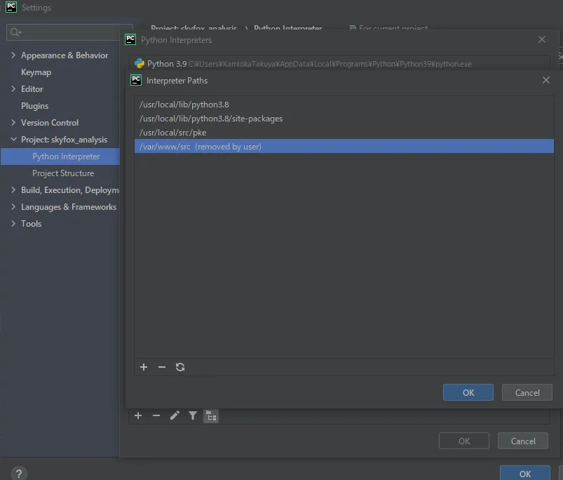 「File | Settings | Project: MyProject| Python Interpreter」から該当のものを選択し、一番右側のフォルダツリーっぽいアイコンを押すと以下の画面が表示されます。 そうしたら不要なものを選択して「ー」を押します。